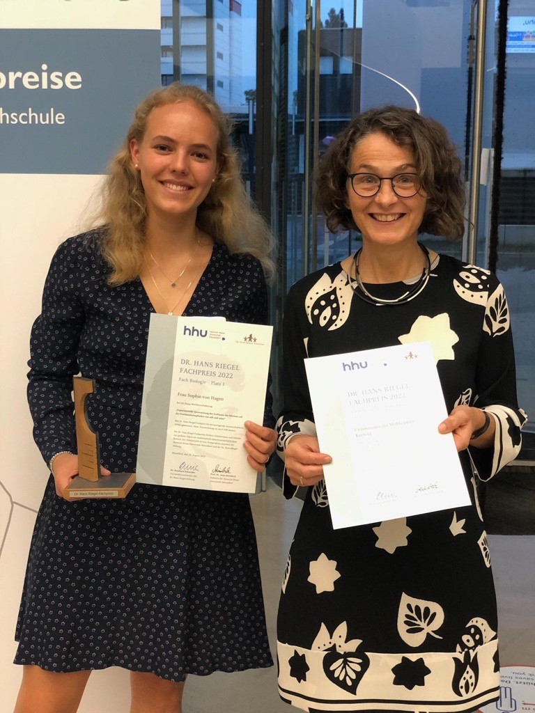 Für ihre Facharbeit im Leistungskurs Biologie zum Einfluss des Sehsinns auf das Geschmacksempfinden von süß und sauer wurde Sophie von Hagen (Q2) von der Dr. Hans-Riegel-Stiftung mit dem 1. Preis in der Heinrich-Heine-Universität Düsseldorf ausgezeichnet. Die mit 600 € dotierten Fachpreise werden für besonders gute vorwissenschaftliche Arbeiten in den MINT-Fächern vergeben.
