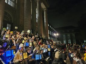 Am 9. November 2023 feierten die Schülerinnen und Schüler des Gymnasiums am Moltkeplatz vor dem Hauptportal das Martinsfest. Warme Getränke, der Martinstütenverkauf der Q2 und das Martinsschauspiel mit Feuer sind dabei natürlich in jedem Jahr ein Muss.