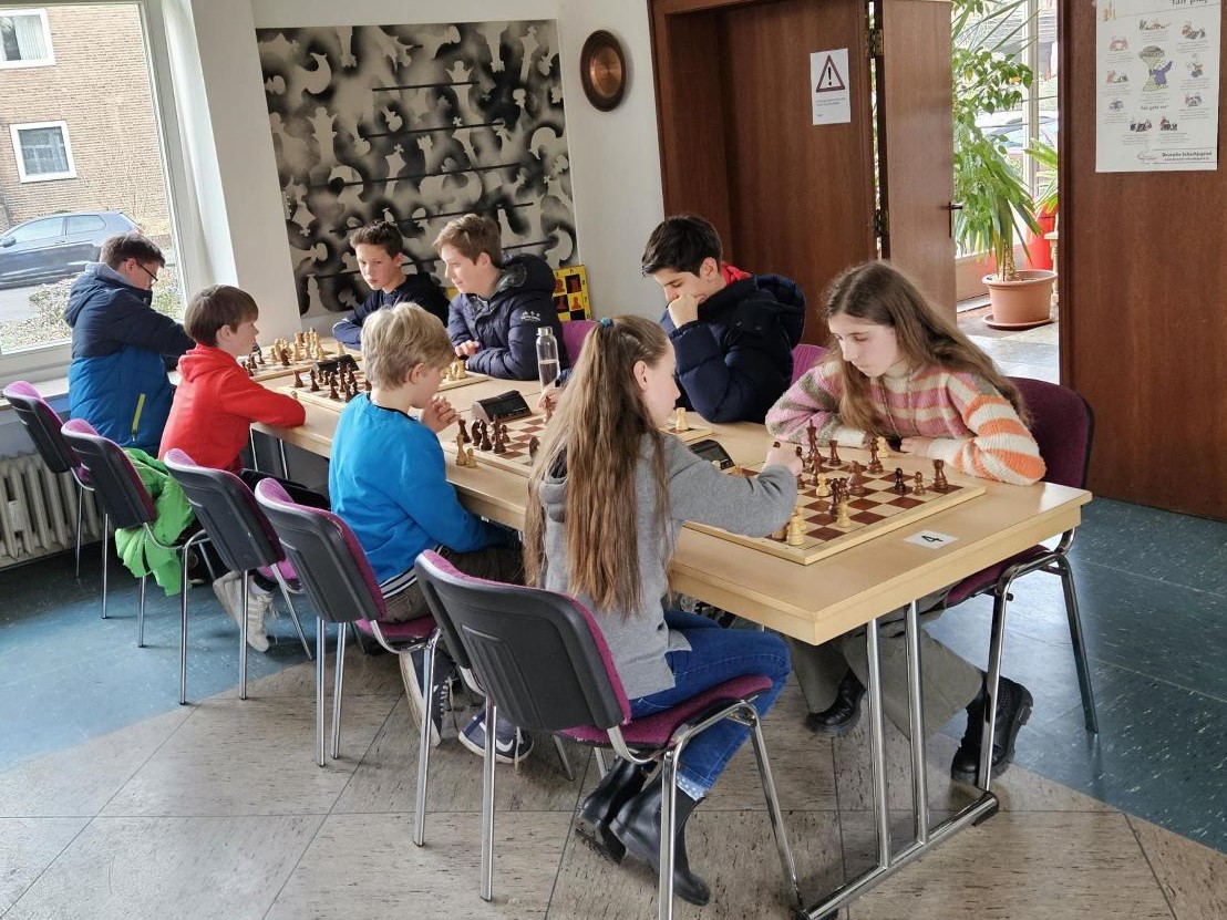 Am nächsten Tag, dem 23.2., gingen auch die Schüler des älteren Teams nach der 4. Stunde los. In diesem Turnier traten die Schüler*innen des Jahrgangs 2007-2009 gegeneinander an. Teilnehmer des Moltke waren Paul Erben 8b (Brett 4), Jonas Kremer 7c (Brett 3), Ben Brojtman 7c (Brett 2) und Nikolaj Veselov 8c (Brett 1). Auch hier gab es viele spannende Runden. Am Ende des Tages landete das Moltke-Team auf dem 4. von 5 Plätzen. Auch hier siegte die Marienschule. Insgesamt hatten die Teilnehmer sehr viel Spaß dabei, ihre Leidenschaft von Schach ausleben zu können.