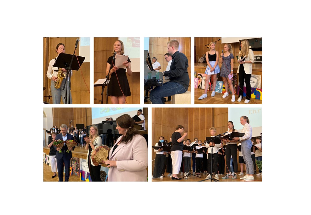 „Der europäische Gedanke und das Leitbild unserer Schule ist Gemeinsam. Mehr erreichen. Gemeinschaft - das heißt zusammen, nicht ohne den anderen, als Team sich gegenseitig supporten, anfeuern, Ideen entwickeln und weiterspinnen, füreinander einstehen, kreativ sein“, mit diesen Worten begann Moderatorin Julia Lemke das Europakonzert am 21.06.2022. Begleitet von viel Musik und Kunst wurden an diesem Abend zahlreiche Moltkeschülerinnen und -schüler für besondere Leistungen geehrt. Die zweistündige Veranstaltung stand unter dem Zeichen Europas und es schien, als habe sich das Festkomitee noch mehr ins Zeug gelegt als je zuvor.  Durch lange Vorbereitungen und viel Engagement war ein umfangreicher Abend voller verschiedener Auftritte organisiert worden. Die Aula war mit bunten Europafahnen geschmückt und auch die PowerPoint-Präsentation, die alle Inhalte unterstützte, hatte von Frau Lemke ein farbenfrohes Glow-Up erhalten. Für ihren besonderen Einsatz, Forschergeist, Kreativität und sportliche Höchstleistungen waren an diesem Tag mehrere Jugendliche unterschiedlichen Alters zusammen mit ihren Familien eingeladen worden. Das Konzert startete mit drei Beiträgen des Chors der Stufen 5-7 unter der Leitung von Frau Dederichs und Herrn Bock. Zur Aufführung kamen drei Lieder aus unterschiedlichen Ländern. Gleich zu Beginn begrüßten sie das Publikum mit einem „Hallo, wie geht‘s?“ in Englisch, Niederländisch, Französisch und Spanisch, gefolgt von dem Solo einer französischen Gastschülerin. Nach diesem kraftvollen Einstieg begannen die Ehrungen der Gewinnerinnen und Gewinner von Wettbewerben in Sport, Sprachen, Kunst, Mathematik und Naturwissenschaften, aber auch schulischem sowie sozialem Engagement. Darunter der Vorlesewettbewerb, die Matheolympiade, der Känguru Wettbewerb, The Big Challenge, Einsatz bei Spendenaktionen für die Menschen in der Ukraine sowie die Unterstützung unserer neuen Mitschüler und Mitschülerinnen in der internationalen Klasse. Dabei führten Frau Lemke und die Schülerin Caroline Breitwieser (Q1) als Moderatorinnen das Publikum abwechslungsreich durch das Programm und nahmen sich Zeit, jede einzelne Leistung ausführlich zu würdigen, wobei auch die Teilnehmenden selbst zu Wort kamen. Über Trockenheit und Langeweile konnte sich hier sicher niemand beklagen, denn die beiden unterhielten die Zuschauerinnen und Zuschauer ausgezeichnet. Nach zwei weiteren beeindruckenden Instrumentaleinlagen an Klavier und Querflöte gab es eine kurze Pause, in der die Q1 alle Besucherinnen und Besucher mit Getränken und Salzstangen versorgte. Zeitgleich ließen sich auch die im Flur ausgestellten Kunstwerke zum Thema „Was ist schön?“ bewundern, die, ebenso wie Selbstportraits am Fuße der Bühne, viele neugierige Blicke auf sich zogen.