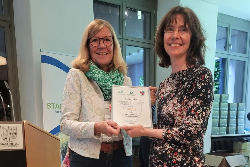 Bei der diesjährigen Preisverleihung am Von-der-Leyen-Platz, nahm die begeisterte Radlerin Frau Köntges den Preis stellvertretend für unsere Schule in Empfang.