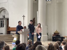 Am Beginn des Einschulungstages stand der Gottesdienst – in diesem Jahr gestalteten ihn Schüler der achten Klasse. Sie alle haben jüngere Geschwister unter unseren „Neuen“ und begrüßten diese im Namen der ganzen Moltke-Familie mit vielen anregenden Denkanstößen zu Thema „Gottes Segen“.