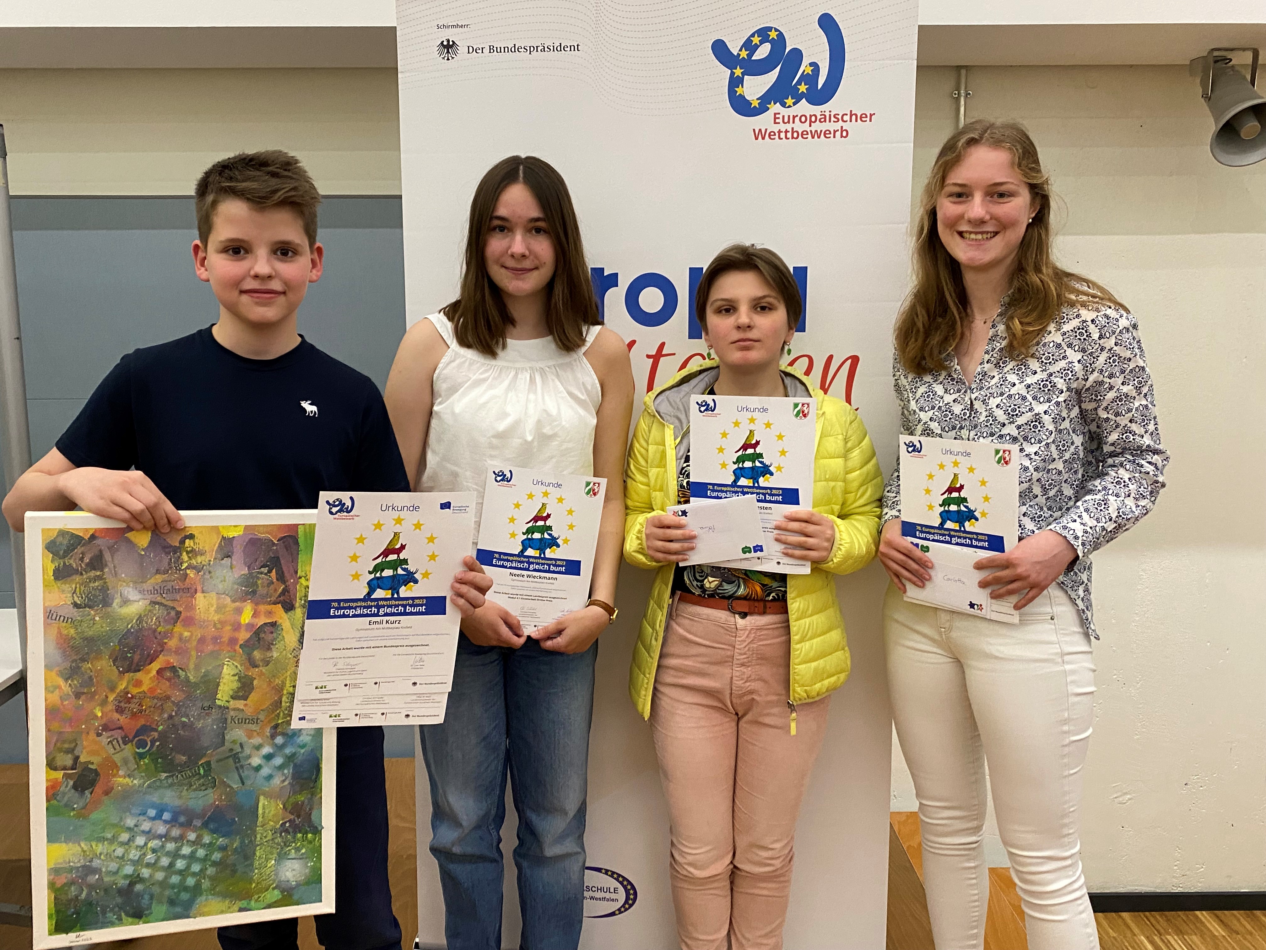 „Europäisch gleich bunt. Junge Visionen für ein Europa der Vielfalt“ war in diesem Jahr das Motto des landes- wie bundesweit ausgetragenen Kreativ-Wettbewerbs. Und der hatte es in sich, nahmen doch fast 70.000 Schülerinnen und Schüler die Einladung an, sich in verschiedenen Modulen kreativ mit diesem Thema auseinanderzusetzen und Wettbewerbsbeiträge einzureichen. Diese sollten sowohl verdeutlichen, was in Europa gut gelingt, als auch Missstände aufzeigen.