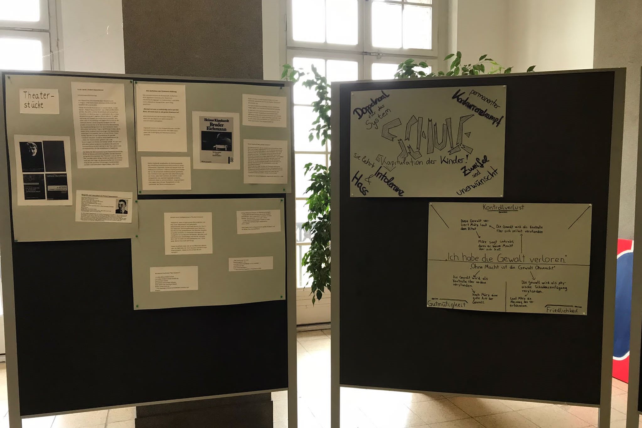 Während der Veranstaltung präsentierte die EF außerdem, womit sie sich am Projekttag beschäftigt hatte. So wurde zum Beispiel ein Podcast abgespielt, der sich vor allem auf Kipphardts Kindheit konzentrierte. Auch wurden zwei Märzgedichte Kipphardts vorgelesen sowie der Text „Sonntagsspaziergänger“ und „Mein Lieblingsplatz“. Zu dem letzten Gedicht trug der Schüler Valantis Palaskas seine eigene Version über seinen Lieblingsplatz vor. „Der Lieblingsplatz ist bei jedem anders. Da wollte ich meine eigene Kreation schaffen“, sagte er über seinen Text. Im Foyer wurden auch weitere Nachdichtungen der EF ausgestellt. Frau Schaeper zeigte sich besonders beeindruckt von den vorgestellten Kreationen der Schülerinnen und Schüler.