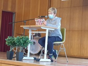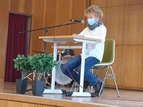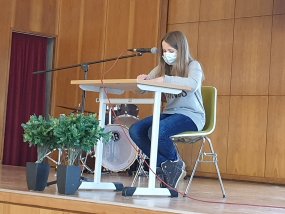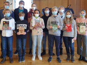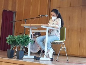 Aufgeregtes Stimmengewirr erfüllt den Raum und viele Köpfe recken sich nach der ersten Reihe, in der die nervösen Kandidaten des Vorlesewettbewerbs 2021/2022 der sechsten Klassen sitzen. Sie alle umklammern ein ausgesuchtes Buch, aus dem sie alle eine ausgesuchte Textstelle vorlesen werden. Nach einigen erklärenden Worten Herrn Langes kann der Wettbewerb starten und die erste Kandidatin Sana betritt mit ihrem Buch „Liliane Susewind: Giraffen übersieht man nicht“ von Tanya Stewner die Bühne. Nach der etwa vierminütigen Textstelle gibt es allseits viel Applaus und die nächsten Teilnehmer, darunter Florian, Jule, Jonas, Emilia und Caius, werden nacheinander auf die Bühne gebeten. Alle tragen einen eigenen vorbereiteten Text gestaltend vor.
