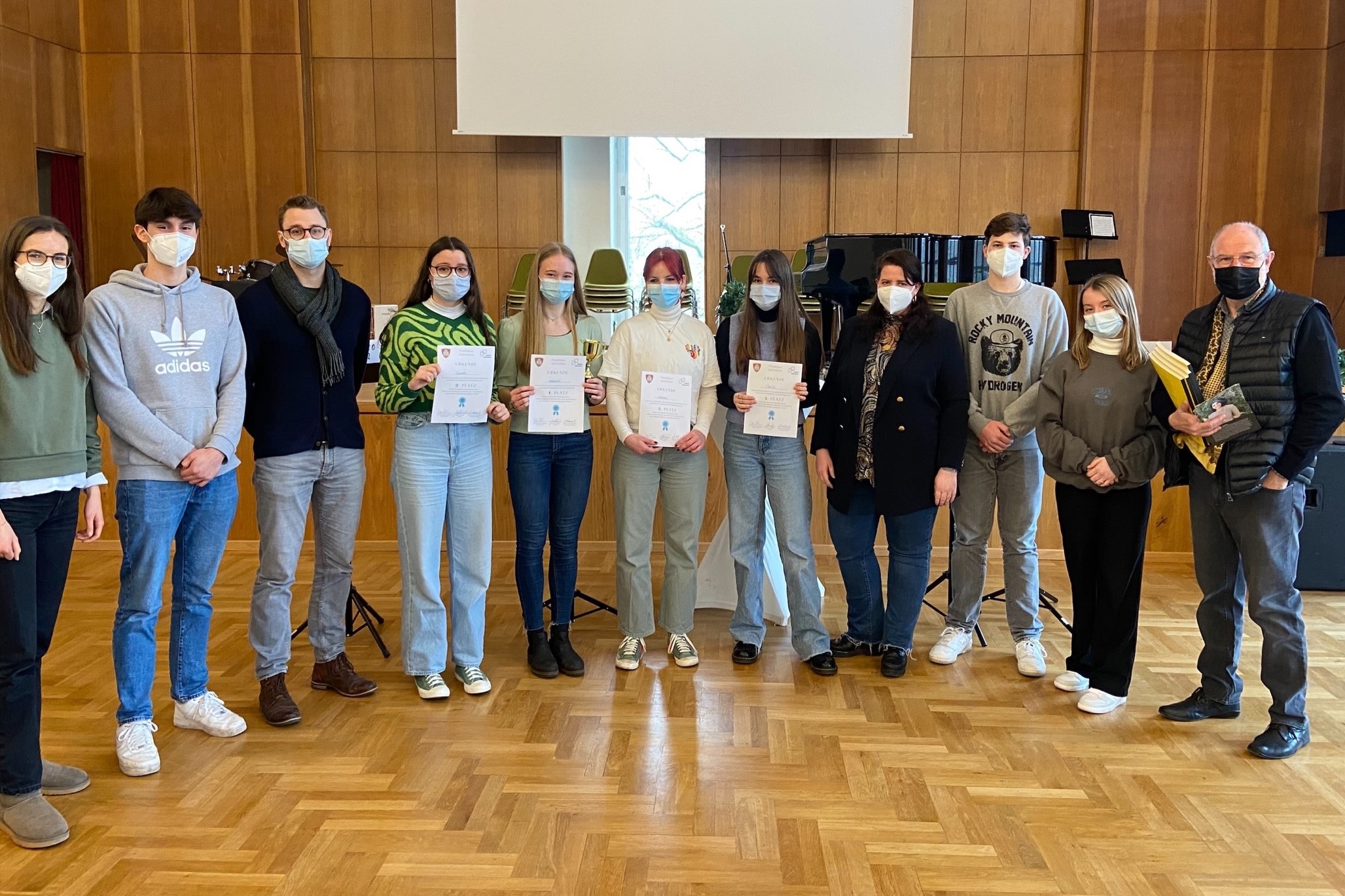 Nach der Debatte wurde das Publikum zu seiner eigenen Meinung zum Thema mittels einer Abstimmung per Handzeichen befragt, das Ergebnis jedoch nicht bekanntgegeben. Während der Beratung der Jury, bestehend aus Frau Lemke, Herrn Birkenbach, dem Schulpaten Peter-Michael Friedrichs von Amnesty International, einem Schüler des Kurses, Max Husemöller, und der Schulsprecherin Cecilia Eich, wurde noch einmal der Projektkurs Rhetorik von der Moderation beworben. Die Spannung im Raum stieg, doch bevor endlich die Ergebnisse verkündet werden konnten, richtete noch einmal Peter-Michael Friedrichs sein Wort an das Publikum. Er arbeitet seit 49 Jahren für Amnesty International, einer Organisation für Menschenrechte. Sein Appell: In China werden momentan viele Menschen zu Unrecht festgenommen, unteranderem Hayrigul Niyaz und Zhang Zhan, die als eine der ersten über die Corona-Pandemie berichtete. Als Zeichen der Solidarität rief er dazu auf, Plakate der beiden zusammen mit einer Kerze und einem QR-Code in die Fenster zu stellen, damit sich Vorbeigehende informieren können. Nachdem die Plakate für die Schule überreicht worden waren, wurden, zusammen mit einem individuellen Feedback, die Siegerinnen bekannt gegeben. Ein vierter Platz fiel dabei weg. Den dritten Platz erhielt Neele Wieckmann. Platz zwei teilten sich Aliena Krull und Sarah Franßen (alle Q1), die damit die Reserve für den Regionalwettbewerb bilden. Isabelle Harms überzeugte neben ihren Sachkenntnissen, den Beispielen und einem guten Sprechen auch mit ausdrucksstarker Mimik und Gestik, so die Jury. Damit wurde sie für den ersten Platz ausgewählt und wird unsere Schule im digitalen Regionalwettbewerb vertreten. Das Verleihen der Urkunden und eine Verabschiedung von Seiten der Moderation, die sich vor allem bei Frau Lemke und Herrn Birkenbach für ihr Engagement bedankte, schloss die gelungene Veranstaltung ab.