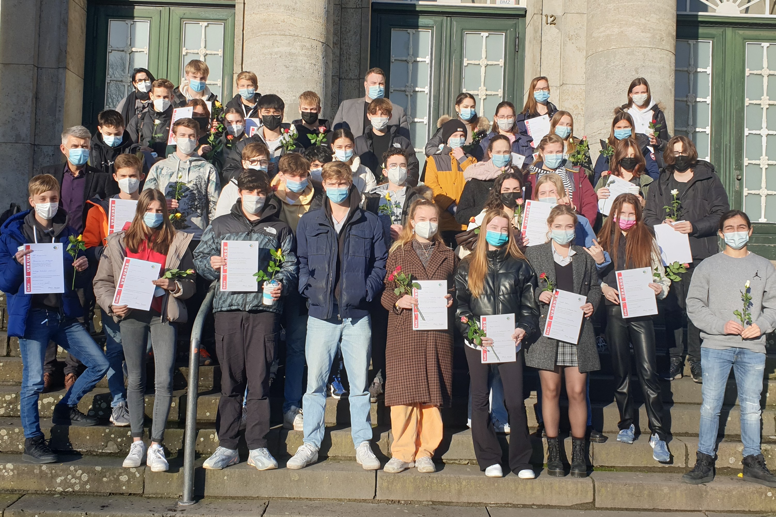 Als sich am 20. Dezember 2021 in der 5. und 6. Stunde die Jahrgangsstufen 9 und EF in der Aula versammelten, war das schon etwas Besonderes. Immerhin hatten sich dort nach Jahrgängen getrennt deutlich über 100 Schülerinnen und Schüler eingefunden, um im feierlichen Rahmen den erfolgreichen Abschluss des Soko-Projektes, das schon im dreizehnten und vierzehnten Jahr in Folge unter der Schirmherrschaft des Deutschen Jugendrotkreuz am Moltke durchgeführt wurde, zu begehen.