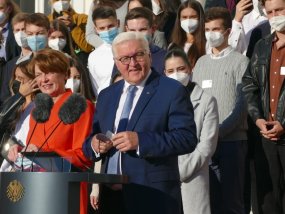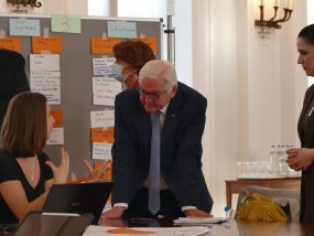 Der zweite Tag war mit vielen neuen Erfahrungen verbunden. Nach erneuten Coronatests und Sicherheitskontrollen war die veränderte Stimmung im Schloss Bellevue greifbar, denn der Bundespräsident und seine Frau kamen zu Besuch! Sie wollten sich anhören, was junge Menschen, besonders nach 1,5 harten Corona-Jahren, von der Politik forderten. Presse und Fernsehsender wie ARD und ZDF waren ebenfalls geladen, sodass die Veranstaltung eine hohe mediale Reichweite erzielte. Nach der symbolischen Schlüsselübergabe an die Teilnehmenden schauten sich Frank-Walter Steinmeier und seine Frau, Elke Büdenbender, im Einzelnen an, was die verschiedenen Gruppen erarbeitet hatten. Ich hatte sogar die Möglichkeit, mit dem Bundespräsidenten über meine Anliegen und Forderungen hinsichtlich Bildung zu sprechen, was sehr aufregend war. Zudem wurden eine weitere Teilnehmerin und ich von einem Vertreter des Magazins „watson“ interviewt, welcher einen Artikel über das Takeover veröffentlichte. Am Nachmittag folgte die Abschlusspräsentation der erarbeiteten Ergebnisse aller Gruppen, der Frank-Walter Steinmeier und Elke Büdenbender beiwohnten. Andere Gruppen hatten ihre Inhalte in Form eines Poetry-Slams, Theaterstücks oder Vortrags aufbereitet. Nach diesen informativen 1,5 Stunden ging die Veranstaltung entspannt mit dem Auftritt von zwei Berliner Bands, viel Spaß und guter Stimmung zu Ende.