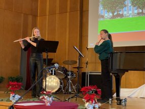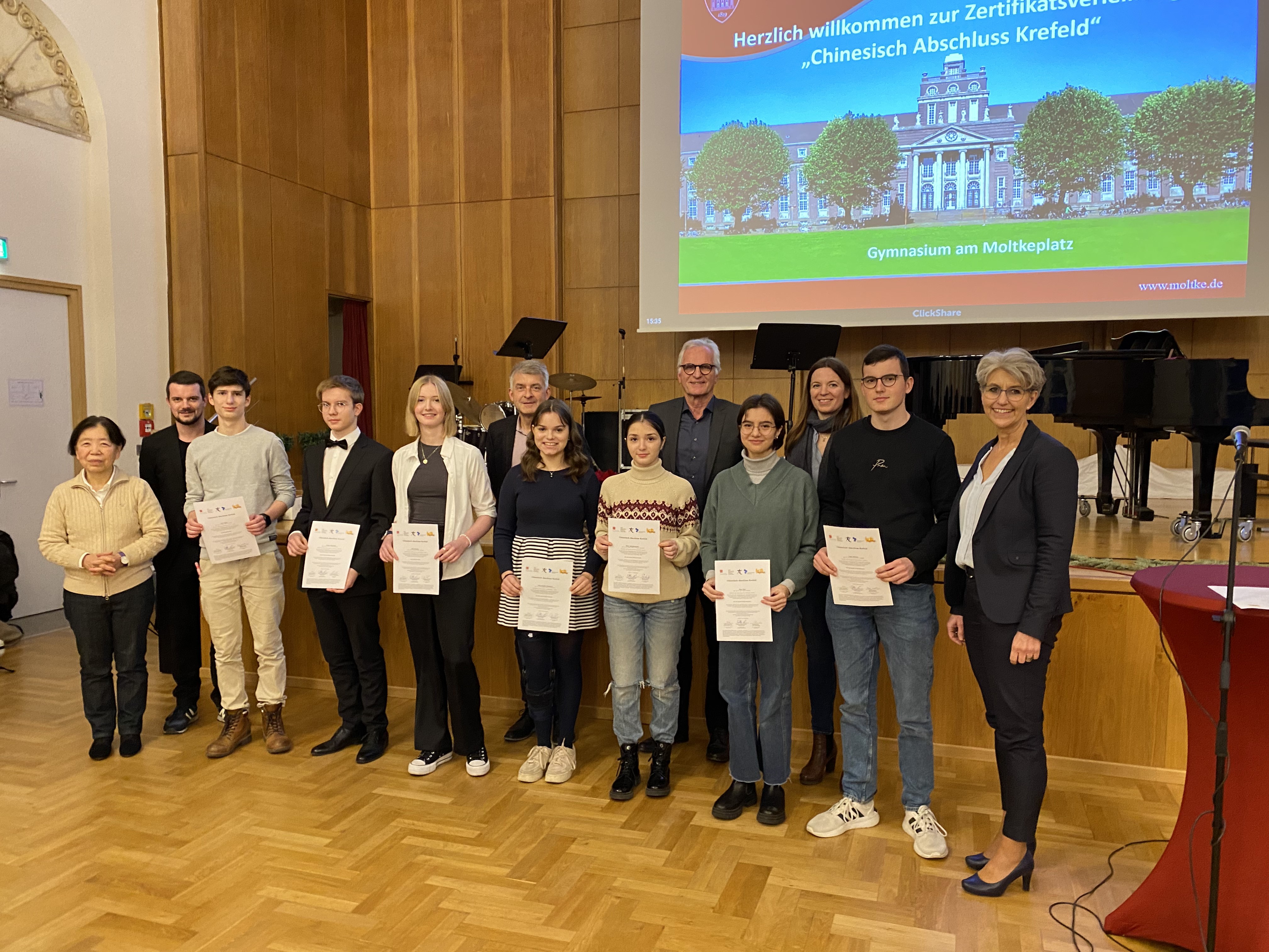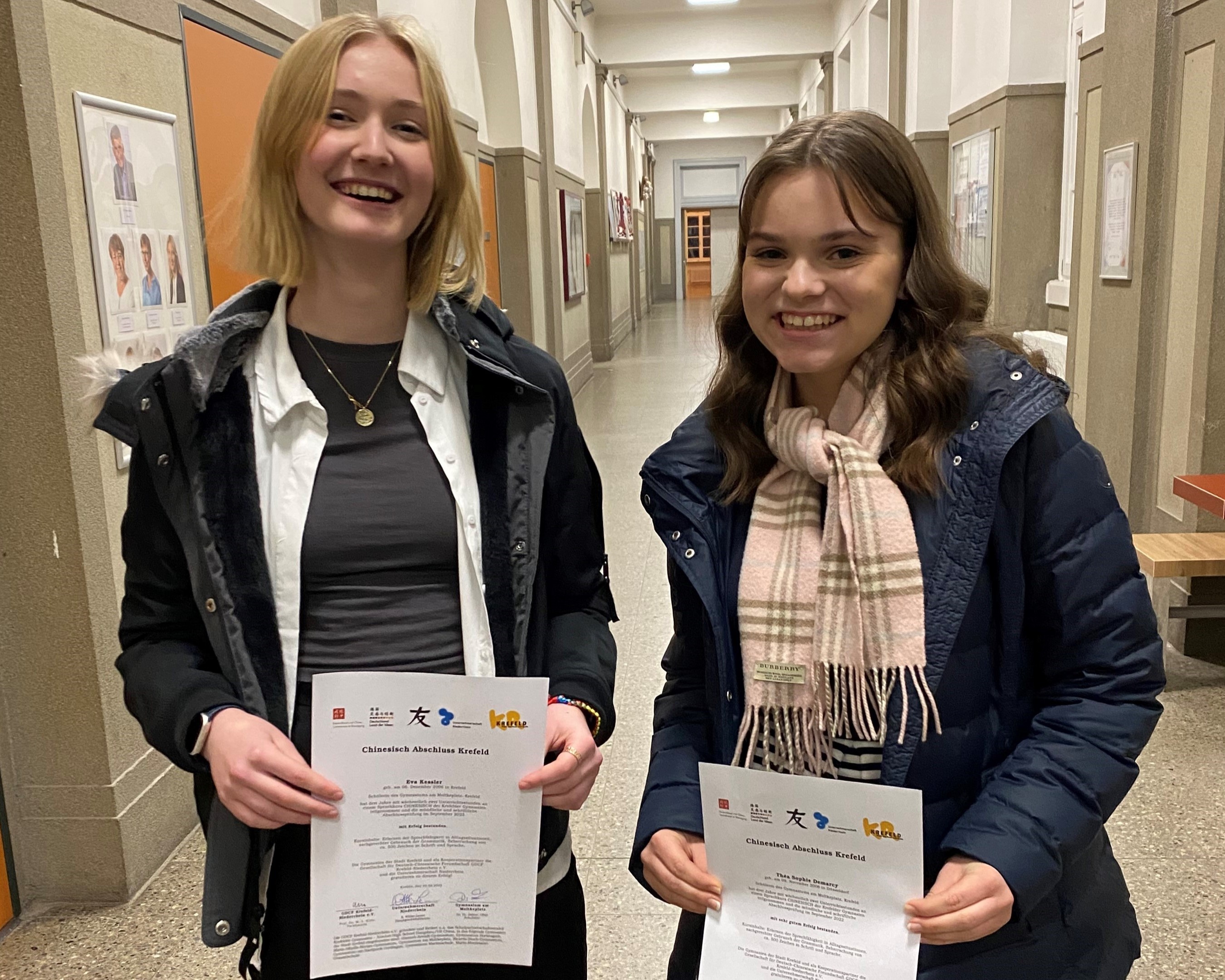 In einer Feierstunde in der Aula wurden am 15. Dezember die Teilnehmerinnen und Teilnehmer des dreijährigen Chinesisch-Zertifikatskurses nach bestandener Abschlussprüfung geehrt. Insgesamt acht Schülerinnen und Schüler der Krefelder Gymnasien erhielten das Zertifikat. Unsere Schule durfte sich gleich über zwei Absolventinnen freuen: Thea Demarcy und Eva Kesseler.