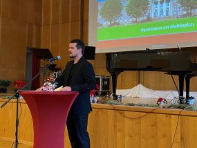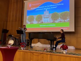 Das Programm der Ehrung wurde von Elena Koch mit „How deep is your love“ von den Bee Gees auf dem Saxophon eröffnet. Schulleiter Dr. Thomas Zöllner begrüßte alle Anwesenden und beglückwünschte die Teilnehmerinnen und Teilnehmer zu ihrem außerordentlichen Erfolg. Der Bürgermeister der Stadt Krefeld Herr Karsten Ludwig erinnerte an die schon lange währende Verbindung der Stadt Krefeld mit China. Nach einem Duo in E-Moll für zwei Querflöten, gespielt von Isabelle Harms und Katharina Müller, beglückwünschte Herr Strohe stellvertretend für Prof. Dr. Marie-Louise Klotz, der Vorsitzenden der GDCF Krefeld-Niederrhein e.V, die Absolventinnen und Absolventen und schlug dabei auch kritische Töne an, die den Systemgegensatz zwischen unserer pluralistischen Demokratie und der Volksrepublik China verdeutlichten. Das musikalische Begleitprogramm rundete anschließend Aliena Krull mit „Melodie für Violine und Klavier“ von A. Rubinstein ab, bevor Kirsten Wittke-Lemm als Hauptgeschäftsführerin der Unternehmerschaft Niederrhein zu den Absolventinnen und Absolventen des Kurses sprach.