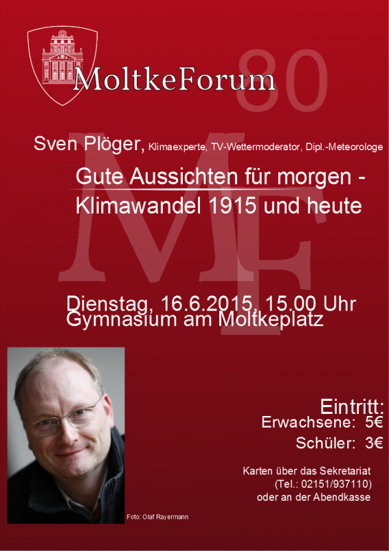 Im Jahr des 100. Geburtags unseres Schulgebäudes freuen wir uns auf den Besuch des u.a. aus den "Tagesthemen" bekannten Wettermoderators Sven Plöger, der als Diplom-Meteorologe und Klimaexperte das Thema "Klimawandel" auf dem 80. MoltkeForum am 16. Juni 2015 ebenfalls aus der 100-Jahr-Perspektive beleuchtet.