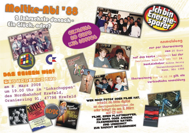 Am 08. März 2008 feierte der Abiturjahrgang 1988 sein Wiedersehen im Rahmen des 20. Abiturjubiläums. Dateianhänge Die Einladung zur Feierjpg | 151.68 KB Gallerie Ähnliche Inhalte Treffen der Ehemaligen und Aktiven am 15.09.2023, 19 bis 23 Uhr04.09.2023 | News Treffen: 50 Jahre nach dem Abitur am Moltke09.12.2022 | News Ein Blick zurück – Ehemaligentreffen am Moltke 24.09.2022 | News Abiturientia 1997 am Moltke11.06.2022 | News Die Qual der Wahl – Weihnachtskarte 202022.01.2021 | News Kategorien 1988 Ehemaligentreffen
