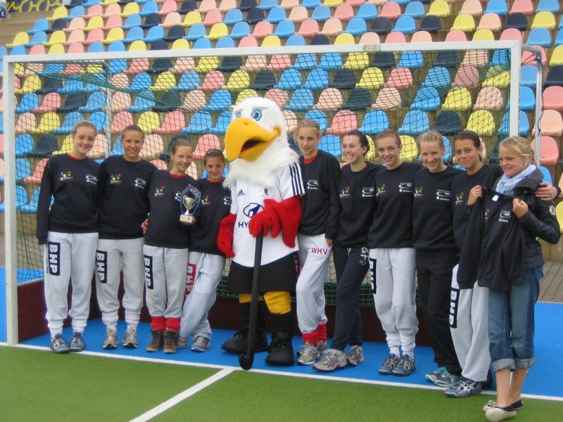 "Das können wir doch auch", haben sich wohl die Hockeymädels gesagt und machten es den Jungs ein Jahr später nach. Sie wurden sensationell Landessieger im Hockeypark Mönchengladbach und dürfen Nordrhein-Westfalen im Herbst beim Bundesfinale in der Hauptstadt vertreten. Vielleicht spielen sie bei Regen besonders gut? Den Eindruck konnte man während der ersten Begegnung gegen ein Dortmunder Gymnasium haben. Beim 17:0 (!) kamen die Zuschauer mit dem Zählen nicht mehr mit. Die Mannschaft hatte das Finale erreicht, und zwar wieder gegen das Gymnasium Broich aus Mülheim. Man erinnerte sich an den knappen Sieg beim Regierungsbezirksfinale; knapp im Vergleich zu gestern: 10:0 , Broich war einfach chancenlos. Torhüterin Pauline hatte fast einen freien Tag und ließ keinen Treffer zu. Richtig stolz waren CHTC-Trainerin Carolin Velmans und der mitgereiste Fanclub auf das perfekte Team: