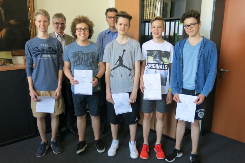 Seit seiner Gründung im Jahre 1979 bietet der Bundeswettbewerb Fremdsprachen interessierten und talentierten Schülerinnen und Schülern die Möglichkeit, sich in einer Reihe von zur Auswahl gestellten Sprachen und Wettbewerben mit anderen Schülerinnen und Schülern aus dem Bundesgebiet zu messen. Für unsere Schule nahmen dieses Jahr Nathan Bergé, Alexander Schmitz, Paul Hülser, Nic Hinz und Carlo Verwiebe, allesamt Schüler auf der Jahrgangstufe 9, im Bereich „Alte Sprachen“ (Latein) teil und erzielten beachtliche Ergebnisse. In einem feierlichen Augenblick empfingen die stolzen Teilnehmer ihre verdienten Auszeichnungen aus den Händen unseres Schulleiters, der es sich nicht nehmen ließ in einer kurzen Rede den Eifer und die Bereitschaft der Schüler für die lateinische Sprache, Literatur und Kultur zu loben.