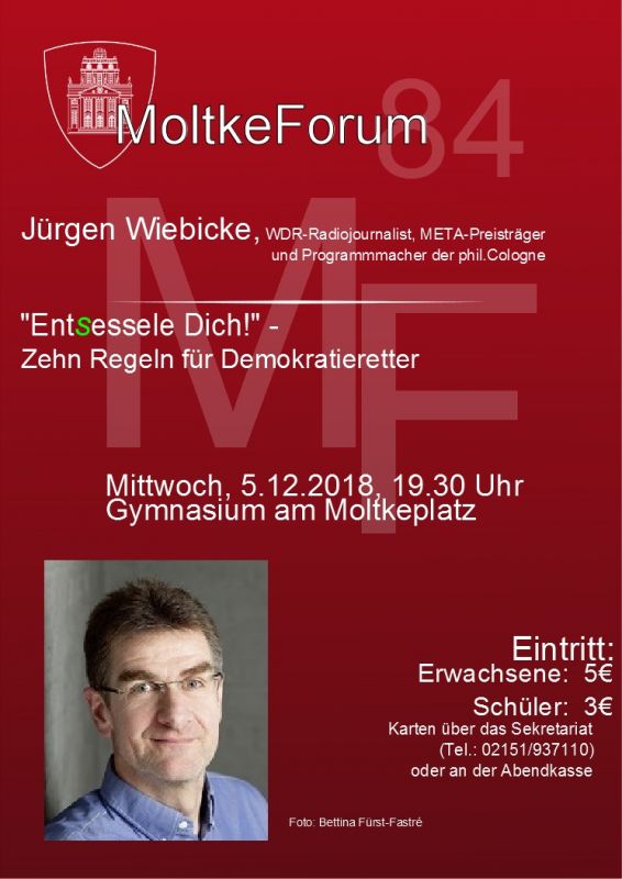 Am Mittwoch, den 5.12.2018, 19:30 Uhr, ist beim 84. MoltkeForum der WDR-Radiojournalist, META-Preisträger und Programmmacher der phil. Cologne, Jürgen Wiebicke, Gast im Gymnasium am Moltkeplatz. Er präsentiert in der Aula „Zehn Regeln für Demokratieretter“. Sein unter dem gleichnamigen Titel erschienenes Buch ist eine direkte Reaktion auf den Wahlsieg von Donald Trump 2016.
