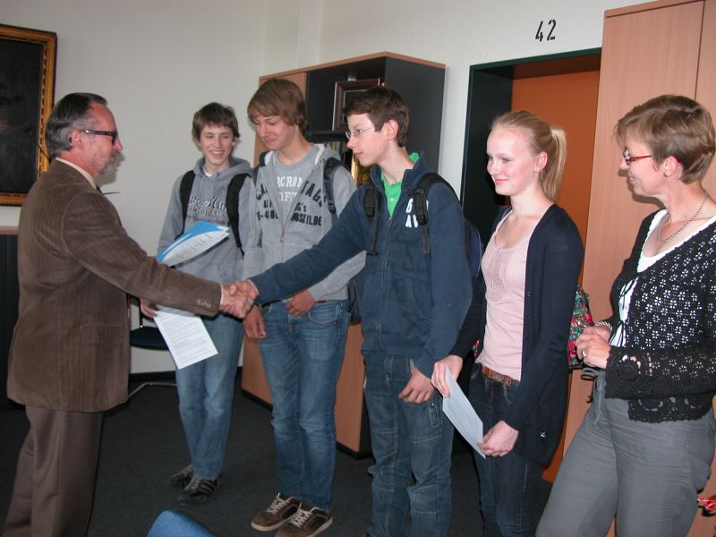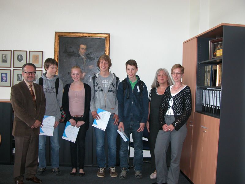 Am Bundeswettbewerb Fremdsprachen im Fach Latein haben Alexander Fassin, Max Freundlieb, Jannik Gröne und Leah Meinert (alle Klasse 9b) teilgenommen. Herr Neumann überreichte ihnen Urkunden als Auszeichnung in Anwesenheit von Frau Dr. Verwiebe (Fachlehrerin) und Frau Küster (Regionalbeauftragte der Bezirksregierung Düsseldorf für den Wettbewerb). Die vier Schüler haben Anfang des Jahres einen ganzen Schulvormittag lang an Aufgaben getüftelt, deren Niveau deutlich über den normalen schulischen Anforderungen lag. Jannik Gröne, der schon zum zweiten Mal teilnahm, erreichte dabei die Jury-Bewertung „überdurchschnittlich“. Herzlichen Glückwunsch!