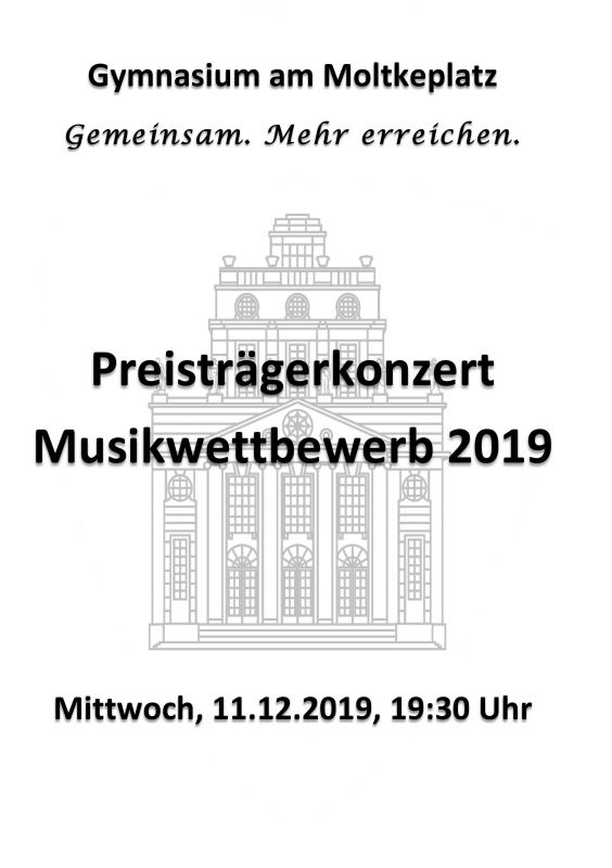 Die Endausscheidung im Moltke-Musikwettbewerb wird als öffentliches Preisträgerkonzert in der Aula gestaltet, zu dessen Besuch die Fachgruppe Musik am Mittwoch, d. 11.12.2019, ab 19.30 Uhr alle Mitglieder der Schulgemeinschaft herzlich einlädt. Wir freuen uns erneut auf musikalische Beiträge auf hohem Niveau!