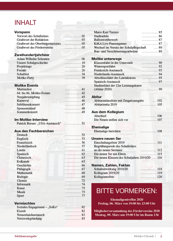 Die Redaktion des Jahresheftes freut sich, die Jubiläumsausgabe „Moltke-Chronik #47“ präsentieren zu können. In den nächsten Tagen wird sie an alle Schülerinnen und Schüler kostenlos verteilt. Die Mitglieder des Fördervereins, die keine Kinder mehr an unserer Schule haben, erhalten ihr Exemplar ab Mittwoch im Sekretariat.