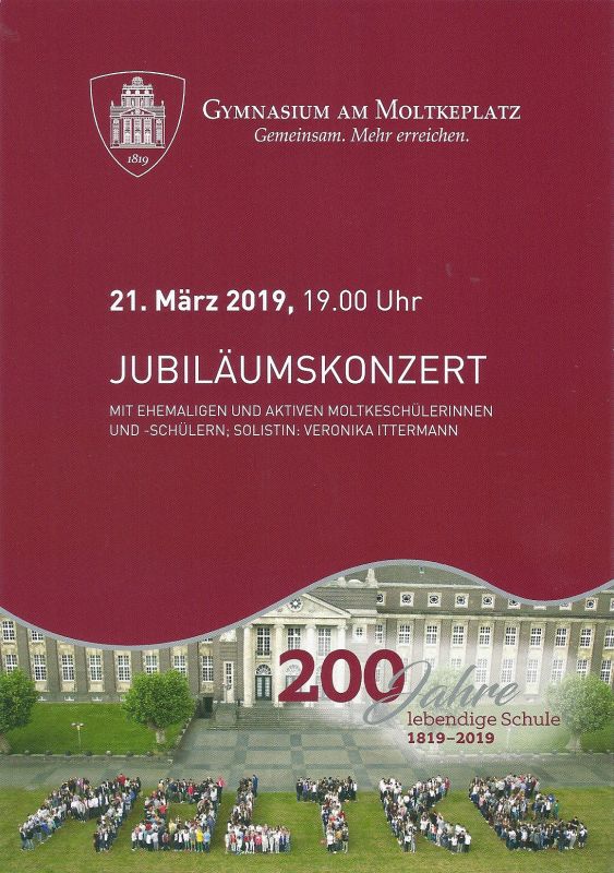 Aktuell aktive Schülerinnen und Schüler, Schülerinnen und Schüler der vergangenen Jahre sowie weitere Angehörige unserer Schulgemeinschaft gestalten gemeinsam einen musikalischen Abend im Jubiläumsjahr. Neben Jazzbeiträgen u.a. mit der früheren Moltke-Schülerin Anja Worts (Gerritzen) und einzelnen kammermusikalischen Vorträgen von Brahms, Halvorsen und Bach präsentiert sich das speziell für diesen Anlass zusammengekommene Moltke-Jubiläumsorchester 2019 mit James-Bond-Filmmusik, Michael-Jackson-Klassikern, dem Klavierkonzert des Niederländers van Rooyen sowie dem Kopfsatz der 5. Sinfonie von Beethoven.
