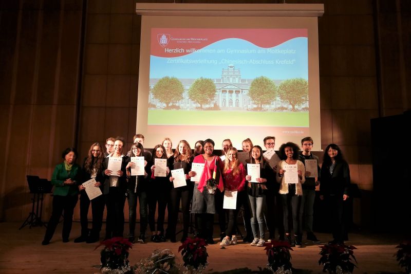 Als gastgebende Schule des diesjährigen Chinaaustauschs fand die Austragung der Zertifikatsverleihung des Chinesisch-Abschlusses am 12.12.2017 am Gymnasium am Moltkeplatz statt. 17 Schülerinnen und Schüler von sieben Gymnasien Krefelds erhielten diese Auszeichnung nach drei Jahre langem Lernen der uns fremden Sprache. In der Feierstunde erinnerte Herr Dr. Rademacher, der als Delegationsleiter mit Frau Kamp im Frühjahr dieses Jahres den Austausch nach China begleitet hatte, an die vielen schönen Erinnerungen und Erlebnisse der aufregenden Reise. Als Referentin für Bildungs- und Öffentlichkeitsarbeit der Unternehmerschaft Niederrhein betonte Frau Holzhausen den großen Vorteil, den die Schülerinnen und Schüler durch das Erlernen der chinesischen Sprache in der zukünftigen Arbeitswelt haben. Da der Wirtschaftsriese China wieder um 6,9% gewachsen ist, sei es umso wichtiger die internationale Verständnisbildung zu stärken. Dies gelingt unter anderem durch den lebendigen Austausch zwischen deutschen und chinesischen Schülerinnen und Schülern. Dass dieser Schüleraustausch bereits seit Jahren stattfindet, verdanken wir unter anderem Frau Nieter, die vor 31 Jahren die Gesellschaft für deutsch-chinesische Freundschaft im Sinne des Krefelder Modells gründete und für die Öffnung die chinesische Sprache an Gymnasien warb. Ein großes Lob erfuhren die Schülerinnen und Schüler ebenfalls durch Frau Dr. Dr. Lu, Konsulin des Generalkonsulats der Volksrepublik China für Bildungswesen in Düsseldorf. Durch das Beherrschen der chinesischen Sprache, so die Konsulin, sei ein Fenster zur Außenwelt geöffnet worden, mit dem die Schülerinnen und Schüler weiterhin vielfältige Erfahrungen sammeln könnten. Frau Dr. Dr. Lu ist überzeugt davon, dass sie später tragende Säulen in der deutsch-chinesischen Freundschaft werden.
