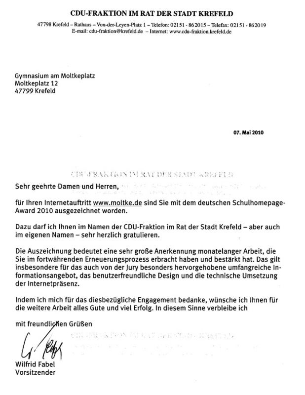 Anlässlich des gewonnenen Homepage-Awards erreichte uns folgendes Schreiben, für das wir uns auch an dieser Stelle vielmals bedanken möchten: Ähnliche Inhalte Finnen finden Moltke toll!02.06.2023 | News FAQ zum Moltke07.12.2020 | News Auszeichnung in Deutsch17.02.2010 | News Moltke-Gymnasium erhält Auszeichnung09.02.2010 | Pressebericht Ministerin ehrt "Moltke"01.02.2010 | Pressebericht Kategorien Moltke im Vergleich