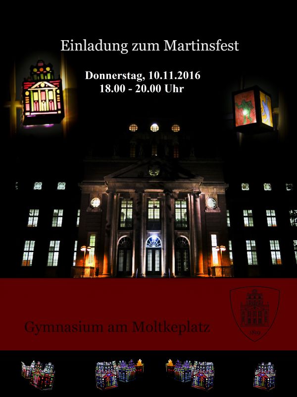 Mittlerweile ist unser Martinsfest schon beinahe eine Tradition: auch in diesem Jahr feiert die Schulgemeinde des Gymnasiums am Moltkeplatz am 10.11.2016 gemeinsam mit ihren Nachbarn und allen Freunden der Schule ihr Martinsfest vor dem Portal des Schulgebäudes. Zu szenischen und musikalischen Darbietungen, Martinsfeuer, kulinarischen Angeboten und verschiedenen Ständen laden wir herzlich ein!