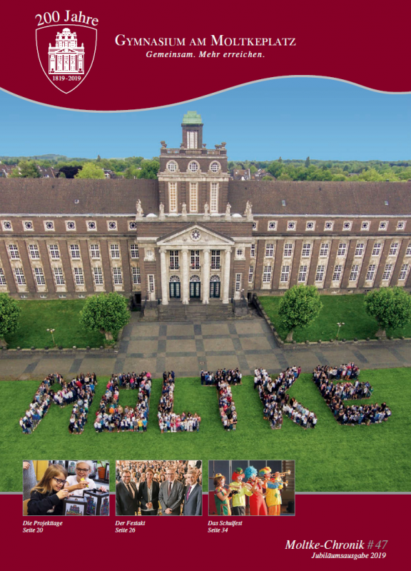 Unsere diesjährige Moltke-Chronik erfreut sich großer Beliebtheit. Achtung! Ehemalige, Freunde und Förderer der Schule sollten sich daher, falls noch nicht geschehen, ein Exemplar dieser besonderen Ausgabe sichern. Die Jubiläumschronik kann über das Sekretariat der Schule kostenlos bezogen werden. Natürlich freut sich der Förderverein über eine freiwillige Spende.