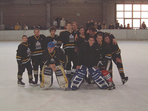 Mit einem grandiosen, nie gefährdeten 16:4 Sieg gegen eine Auswahl des Ricarda-Huch-Gymnasiums feierte die Eishockey-Schulmannschaft einen Riesenerfolg. Sehr sicher standen unsere Spieler auf dem Eis, folgten den klaren Anweisungen ihres Coach: unserem Schulleiter Herrn Haberstroh. Er feierte ebenfalls lautstark jedes Tor genau wie die zahlreichen Schüler, die nach Art der ‚Pinguin-Fans' den Gegner mit einigen Fan-Liedern zusetzten. Eines der schönsten Tore schoss der kleinste Mann auf dem Feld, Robin Beckers (Klasse 5!!), der nach einem penaltyartigen Torlauf eines Mitspielers mit sicherem Instinkt den Abpraller aufnahm und verwandelte. Im Mannschaftsfoto steht Robin links im Bild (neben Herrn Haberstroh).