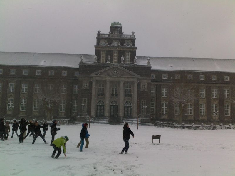 Endlich war es mal wieder so weit: So gegen 8:00 fielen die ersten Flocken und es wurde immer mehr, zur Freude der Kinder, zum Ärger des Hausmeisters, der sofort anfing zu räumen. Die 7c verlegte ihre Sportstunde kurzentschlossen vors Hauptportal und dann hieß das Thema "Schneeballweitwurf" bzw. "Zombieschneeball". Der Schnee hatte eine hervorragende Konsistenz, natürlich auch fürs Schneemannbauen. Die Cafeteria spendete schnell eine Möhre und fertig war der Mann - oder die Frau?