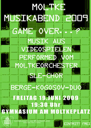 Der Musikabend am Moltke 2009 gehörte wieder einmal zu den Highlights unseres schulischen Lebens. Nach der Begrüßung der zahlreich erschienen Gäste durch den Schulleiter Herrn Neumann wurde der Abend musikalisch durch den Schüler - Lehrer - Eltern Chor mit 5 Liedern eröffnet. Danach gab das Duo Sarah Bergé ( Geige, Klasse 6 ) und Sergei Kogosov ( Klavier, Klasse 8 ) eine 20 minütige Kostprobe seiner musikalischen Fähigkeiten. Das Duo hat beim diesjährigen Bundeswettbwerb Jugend musiziert nur knapp den 3. Platz verfehlt. Der Auftritt wurde vom Auditorium zu Recht begeistert aufgenommen. Im Anschluss spielte das Moltkeorchester Musikstücke zu einer Reihe von legendären Comuterspielen , die mit bewegten Bildern über dem Orchester bildlich in Erinnerung gerufen wurden. Vorher wurden die Spielideen durch Lea Bovenschen und David Krause - beide Mitglieder des Orchesters - erläutert. Von Schülern zu den Spielen gemalte und auf der Bühne präsentierte Bilder ergänzten die Informationen.