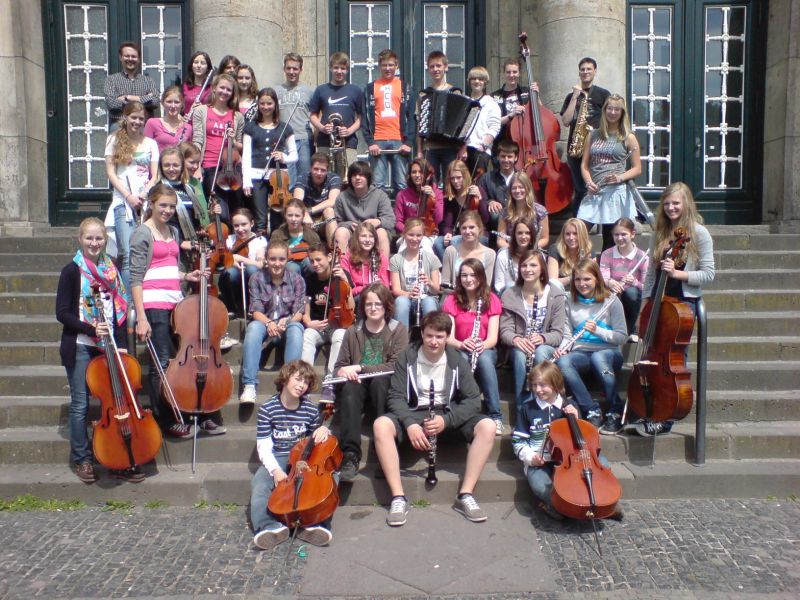 Was heraus kommt, wenn zwei gut funktionierende Schulorchester zusammenkommen, war am vergangenen Samstag in beeindruckender Weise zu beobachten: knapp 30 Musikerinnen und Musiker des Düsseldorfer Suitbertus-Gymnasiums unter Leitung ihrer Dirigentin Natascha Kretschmann-Einsfelder und ihres Streicher-Betreuers Markus Veh waren zu einem ersten musikalischen und menschlichen Kennenlernen zu unseren MoltkeSinfonikern nach Krefeld gereist. Nicht nur das perfekte kulinarische Niveau, für welches die Mitglieder unseres Orchesters als Gastgeber sorgten, sondern auch beeindruckende musikalische Aha-Erlebnisse – so z.B. die Erfahrung eines großen und satten Streicherklanges und das spontane Miteinander am gemeinsamen Notenpult – brachten die Instrumentalisten und Instrumentalistinnen in kurzer Zeit zusammen. Geprobt wurden Werke von Robert Schumann: der 1. Satz der „Rheinischen Sinfonie“ sowie ein Arrangement der „Kinderszenen“, welche beide im November anlässlich des 200. Geburtstages des Komponisten in Krefeld und in Düsseldorf innerhalb eines größeren Programms präsentiert werden sollen.
