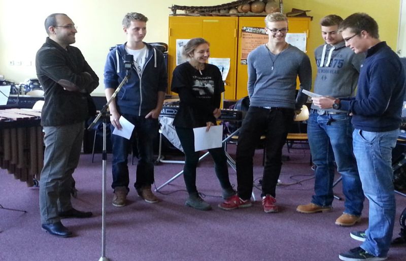 Unter Anleitung von Herrn Bijan Tavili, Dozent für Analyse Neuer Musik an der Folkwang-Hochschule Essen, komponieren seit 4 Wochen die Schüler des Q2-Musikkurses ein eigenes Stück, das sich zur Aufgabe setzt, Elemente orientalischer und abendländischer Musiktradi-tion zu verbinden. Unter dem Arbeitstitel „Wie der Zwist der Liebenden ...“ werden lineare Verzierungstechniken mit improvisatorischen Anteilen und elektronisch bearbeiteten Textcol-lagen kombiniert. Dass eine solche Herausforderung auch vergnügliche Arbeit sein kann, zeigt u.a. das Bild, das bei unseren Textaufnahmen entstand. Die Uraufführung, zu der wir Sie/euch herzlich einladen, findet am Sa., den 12.Oktober um 16 Uhr im Rahmen eines Familienkonzertes der Tage Neuer Musik in der Pax-Christi-Kirche, Glockenspitz 265, statt. Weitere Informationen unter http://www.neuemusik-krefeld.de/ oder (Link Festival Flyer)
