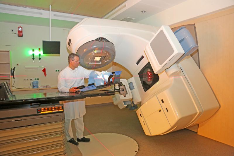 Nach dem Vortrag wurde die Gruppe weiter zu dem Gerät geführt, das zuvor besprochen wurde (“Linearbeschleuniger”). Dieses befindet sich in einem Raum, der auf allen Seiten meterdicke Betonwände besitzt. Die (Schiebe-)tür zum Bestrahlungsraum ist beispielsweise einen Meter dick und besteht aus einer Stahlhülle, welche mit Spezialbeton (Barytbeton mit hoher Dichte) gefüllt ist. Sie wiegt 24 Tonnen. Diese baulichen Strahlenschutzmaßnahmen sollen die Außenwelt und vor allem das Personal des Klinikums vor der ionisierenden Strahlung schützen, die auf Dauer selber auch krebserzeugend wirken kann. Um die Isolation dieser Räume noch einmal unabhängig zu testen, ist jeder Angestellte im Gebäude mit einem kleinen Strahlungsmesser ausgestattet. Dieser ist kaum größer als eine Visitenkarte und dennoch in der Lage, die vorliegende Strahlung kontinuierlich zu messen. Dadurch lässt sich kontrollieren, ob nicht doch gefährliche Strahlen aus den Behandlungsräumen entweichen.