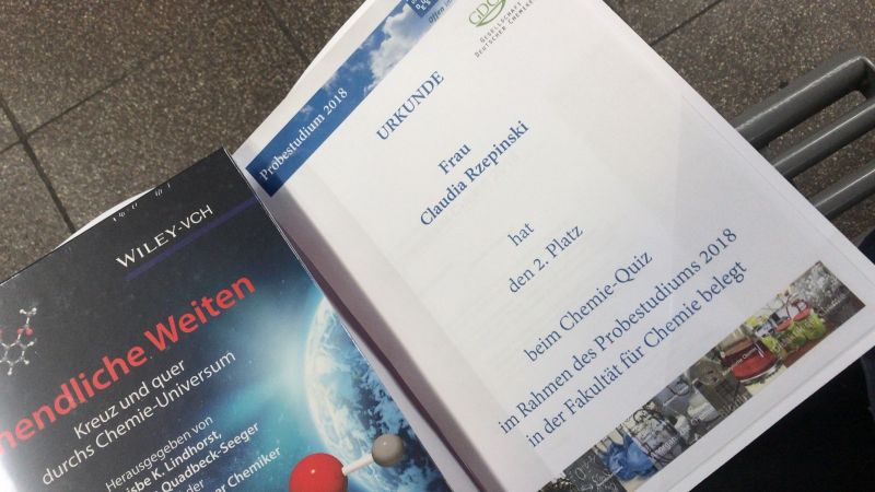 Jedes Jahr ermöglicht die Universität Duisburg-Essen interessierten Schülerinnen und Schülern über ein Probestudium erste Einblick in unterschiedliche Studiengänge zu gewinnen. Ich habe das Studium der Chemie im Winter 2018 erprobt und dabei einen ersten Eindruck des Faches erlangt. Insgesamt bestand das Probestudium aus 8 Vorlesungen. Auf dem Lehrplan standen zum Beispiel Vorlesungen zu den Themen „Anorganische Chemie“, „Water Science“ oder auch „Struktur und Reaktivität von Katalysatoroberflächen“.