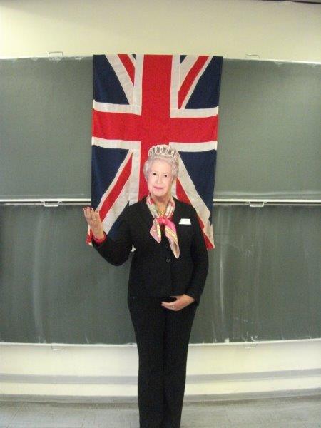 Her Majesty exchanged a few friendly words with Mr. Neumann and was prevailed upon by Mrs Aalam-Behr, head and deputy head of Moltke School, to pose for pictures in the English room, which by happy coincidence was festively decorated with Union Jacks.