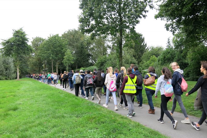 Am 8. September startete pünktlich um 8.30 Uhr nach einem vielstimmigen Countdown die nahezu komplette Schülerschar unseres „Moltke“ Richtung Hülser Berg. Zwei 6. Klassen hatten ihr Laufprogramm bereits gesondert während ihrer Klassenfahrt absolviert. Im Vorfeld des Sponsorenlaufes war lange erwogen worden, ob Streckenführung oder Tag zu ändern seien, da die Wetterprognose für den Freitag mit Böen und Dauerregen äußerst schlecht war. Dass wir mit zunächst nur wenig Nieselregen fast trocken am Hülser Berg ankamen, wurde daher sehr dankbar entgegengenommen und belohnte die Entscheidung, die Veranstaltung wie geplant, wenn auch ohne Rahmenprogramm auf dem Hülser Berg, durchzuführen. Es ist immer wieder ein schönes Erlebnis, mit so vielen motivierten Schülern und Schülerinnen durch die frühherbstliche, noch grüne Umgebung der Schule zu ziehen, frisch gefallene Haselnüsse und glänzende Kastanien auf dem Boden zu entdecken und miteinander ins Gespräch über Gott und die Welt zu kommen. Noch treffen die erlaufenen Kilometer-Gelder bei der Fachschaft Religion ein, so dass es zu früh ist für ein Endergebnis, das natürlich so bald als möglich nachgereicht wird. Danken möchten wir jetzt schon für all die freundlichen HelferInnen auf der Strecke, für die bewährte Verpflegung durch MfA und OberstufenschülerInnen, für den (groß-)elterlichen Fahrdienst und schließlich für die großzügigen Spenden.