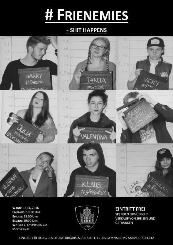 Die Auflösung erfahren Sie und erfahrt ihr am Mittwoch, 15.06.2016, um 19 Uhr in der Aula des Gymnasiums am Moltkeplatz, wenn der diesjährige Literaturkurs der Q1 unter Leitung von Frau Vallée und Herrn Hollmann das Stück „# FRIENEMIES - SHIT HAPPENS“ aufführt.