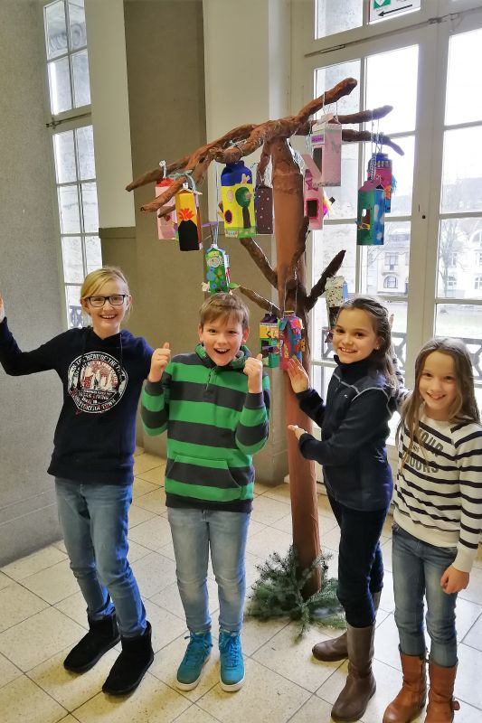 Die Schülerinnen und Schüler hatten großen Spaß bei der Gestaltung eigener Ideen im Sinne des Upcyclings (englisch up „nach oben“ und recycling „Wiederverwertung“). Hier werden Abfallprodukte oder (scheinbar) nutzlose Stoffe in neue und nützliche Produkte umgewandelt. Alte Milchtüten wurden von den Kindern bemalt, beklebt und so verändert, dass bunte Vogelhäuschen entstanden. Diese wurden bereits mit Vogelfutter gefüllt und helfen nun den Vögeln in der kalten Jahreszeit Futter zu finden. Die Wiederverwertung von bereits vorhandenem Material findet sich auch im selbst gebastelten Baum wieder, der aus einer großen Pappröhre und einem alten Regenschirm besteht.