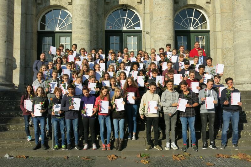 Stolz können wir vermelden, dass auch in diesem Jahr wieder 86 Schülerinnen und Schüler, die im vergangenen Schuljahr ehrenamtliche Arbeit in Kindertagesstätten, Familienzentren, Altentagesstätten, Behinderteneinrichtungen, Sportvereinen oder der Hausaufgabenbetreuung sowie der Spieleausleihe am Moltke geleistet haben, durch einen Vertreter des DJRK und Schulleiter Dr. Udo Rademacher ausgezeichnet werden konnten. Dabei erhielten die jetzigen Neuntklässler am 07. November 2017 im Rahmen einer kleinen Feierstunde, die in der Aula unserer Schule stattfand, eine offizielle Urkunde, die nicht nur ihre erfolgreiche Teilnahme am Projekt dokumentiert, sondern auch bei zukünftigen Bewerbungen dem eigenen Portfolio beigefügt werden kann.