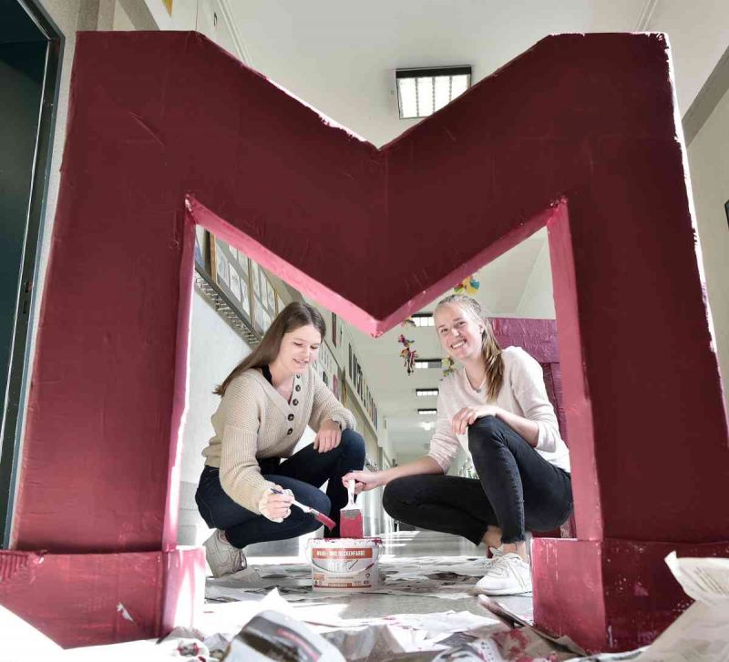 Die Projektgruppe „Moltke kreativ“ will die ganze Deko für das Schuljubiläum herstellen. „Die ganze Schule rödelt, wir auch“, sagen Greta und Vivika. Sie haben mehrfach „Moltke“ in Großbuchstaben hergestellt und malen sie in der Schulfarbe Bordeauxrot an. Gehäkelte Kissen mit dem Schriftzug werden ins historische Café gelegt. „Es ist erstaunlich, dass die Schule in dem historischen Gebäude schon so lange besteht“, sagen die 16-Jährigen.