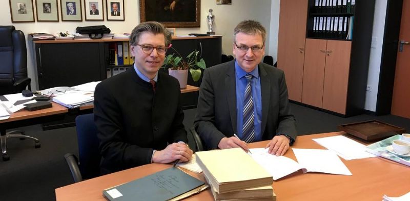 Es sind Schul-Schätzchen wie diese, die sich im Archiv des Gymnasiums am Moltkeplatz befinden. Noch, muss man sagen. Denn ab sofort können die schulhistorisch wertvollen Unterlagen im Stadtarchiv an der Girmesgath eingesehen werden. Schulleiter Udo Rademacher unterschrieb gestern mit Stadtarchivsleiter Olaf Richter eine entsprechende Vereinbarung. Auch wenn die Unterlagen den Ort wechseln, werden sie Eigentum der Schule bleiben.