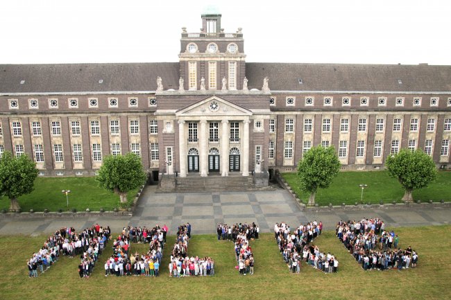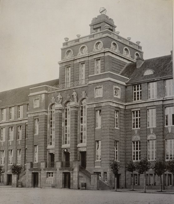 Sommer 1915 – Übergabe des neuen Schulgebäudes am Moltkeplatz. Dazu der Architekt August Biebricher: „Für den Innenausbau und die Einrichtung der Schule sowie den Direktorhausneubau sollten und mussten auch die Wünsche des Lehrkörpers gehört und berücksichtigt werden. Es war keine leichte Arbeit, diese Anforderungen in Einklang mit den vorhandenen Mitteln und den Absichten des Architekten zu bringen. […] Der Kriegsausbruch unterbrach durch die Einberufung des Architekten und eines großen Teils seiner Mitarbeiter den Weitergang der Bauarbeiten […]. Die Einweihungsfeier vollzog sich im Rahmen der ernsten und ungewissen Zeit und in der Hoffnung auf eine festliche Nachholung einer eingehenderen Würdigung des glücklich vollendeten und trotz aller inneren und äußeren Schwierigkeiten allseitig Genugtuung auslösenden Gesamtergebnisses. […] Über dem Giebelfeld mit einem steinernen Früchtekranz eingerahmten Rundfenster auf der Plattform ragen acht von dem aus Krefeld gebürtigen Bildhauer Peter Stammen in Muschelkalk gemeißelte Gestalten empor, die die bildende Kunst, Musik, Baukunst, Geschichte, Turnkunst, Sternkunde, Redekunst und die Naturkunde darstellen […]. Die Baumaterialien sind massiv gewählt, da Putz nicht monumental wirkt. […] Nun noch ein paar Maße für den Gesamtbau: Bei einer Frontlänge von 133 Metern beträgt die Höhe des Gebäudes am Moltkeplatz bis zum Hauptgesims 15,5 Meter. […] In den Klassenzimmern ist der Fußboden mit Linoleum belegt; der untere Wandteil zeigt verschiedenartig abgetönte Ölfarbe, darüber Kaseinfarbe. Das Konferenzzimmer hat bis Türhöhe Eichenholzvertäfelung. […] Im Kellergeschoß […] befindet sich die Schuldienerwohnung und ein Milchausschank; dazu die Zentralheizung usw. Der Schulhof misst etwa 6500 Quadratmeter; ein durch Baumreihen abgetrennter Teil ist als Turnhof gedacht. Den Grundstücksbogen füllen Gärten aus, darunter ein großer Schulgarten. Der schönste Raum des Ganzen und einer der schönsten, wenn nicht der schönste, in Krefeld ist der Festsaal […]. Vierzehn prächtig wirkende ionische Säulen tragen eine Galerie, die ein Gitter abschließt. […] Insgesamt sind die Kosten der Schule auf 1400000 Mark veranschlagt, davon 100000 Mark für die Ausstattung des Moltkeplatzes. Das ist viel Geld. Aber wir sind überzeugt, dass trotzdem jeder, der das Werk einsehen darf, mit der Verwaltung und dem Künstler stolz sein wird auf ein Werk, das ja für Generationen bestimmt ist und das für unsere Stadt ein hohes künstlerisches Gut bedeutet, um das uns viele beneiden werden.“