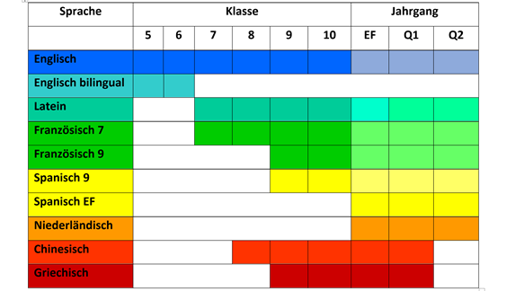 Griechisch ist die älteste noch heute gesprochene Sprache Europas: Seit mindestens 3500 Jahren sprechen Menschen Griechisch. Zudem wird Griechisch im Mittelmeerraum über Syrien, den Iran, Afghanistan bis nach Indien gesprochen - in der Antike ist Griechisch (die erste europäische - Weltsprache und gemeinsames Kommunikationsmedium zwischen Europa und Asien). In der Sekundarstufe I und II wird seit dem Schuljahr 2020/21 eine Griechisch-AG angeboten. Zielgruppe sind Schülerinnen und Schüler der Jahrgangsstufen neun bis Q1.