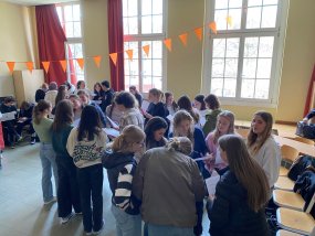 Danach folgte eine Unterrichtshospitation in zwei Schulstunden. Es war interessant zu sehen, wie schnell unsere niederländischen Freunde sich in den deutschen Unterrichtsalltag integrieren konnten. Sie haben sich direkt beteiligt und wir konnten viel voneinander lernen. Im Anschluss gab es zur Stärkung einen Kaffeeklatsch.