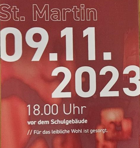 wir laden Sie herzlich zu unserem Martinsfest ein. Die Feier findet am 9. November 2023 statt. Beginn ist um 18 Uhr vor der Schule.