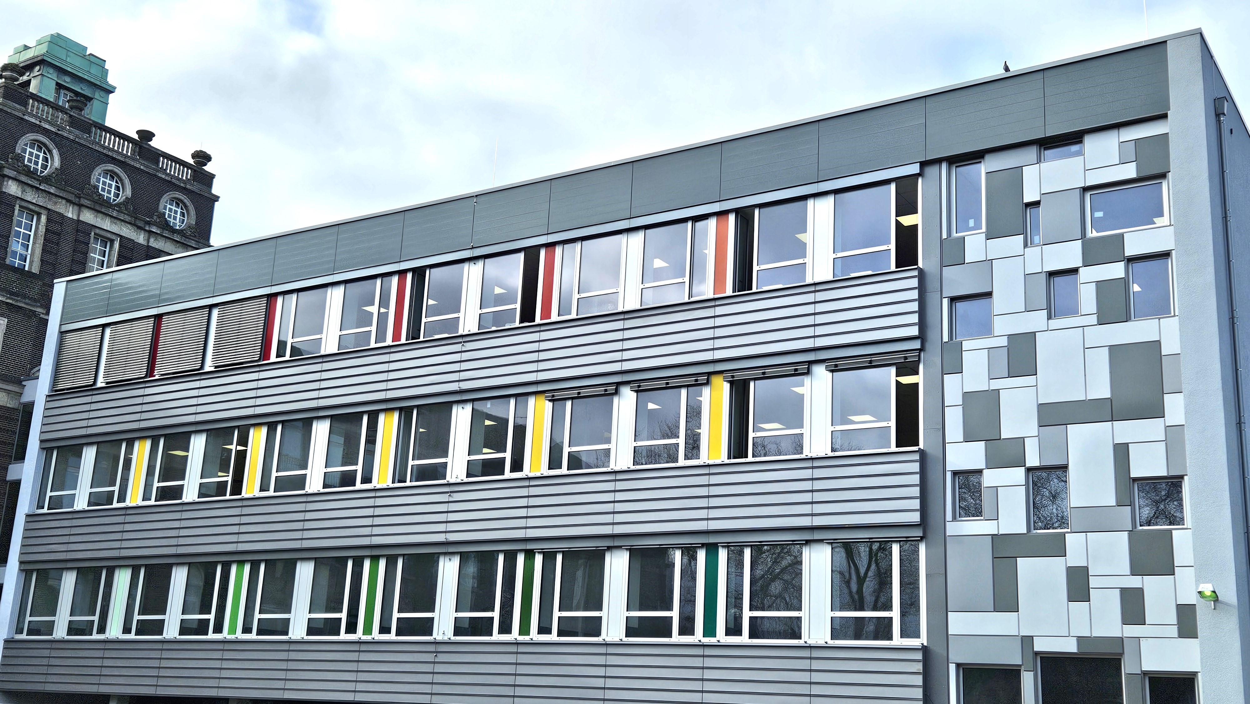 Ein neues Gesicht: Die Fassade des Nordflügels erstrahlt nun in neuem Glanz. Die moderne Gestaltung wertet das gesamte Schulgebäude optisch auf und trägt zu einem einladenden Erscheinungsbild bei.