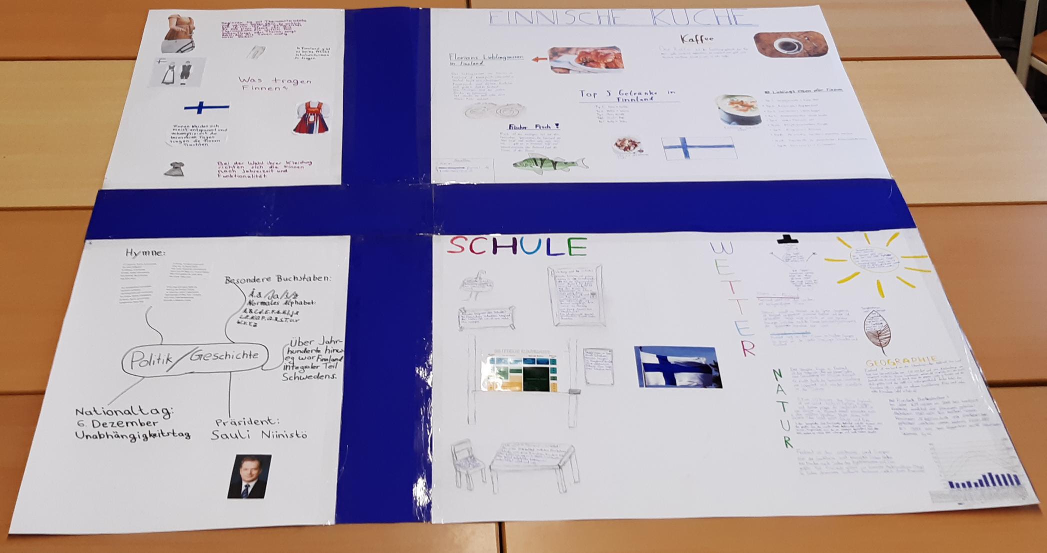Im Rahmen eines kleinen Europaprojekts hat sich die 6a an drei Tagen mit Finnland beschäftigt. In kleinen Gruppen entdeckten die Schülerinnen und Schüler landeskundliche, kulinarische, geographische und kulturelle Besonderheiten des Landes. Alle Ergebnisse wurden zu einer großen finnischen Nationalflagge zusammengefügt, die man in Raum 111 bewundern kann. Bereits vor den Weihnachtsferien haben wir eine Weihnachtskarte an unsere neuen Freunde an der Riihikallion Koulu in Tuusula (Südfinnland) geschickt. Tuusula liegt am Tuusulanjärvi-See in der Landschaft Uusimaa nördlich der Hauptstadt Helsinki. In dieser Woche haben wir auch ein Päckchen mit Briefen (6a + 6b) und einer Reihe von kleinen und großen Gegenständen nach Tuusula aufgegeben, die auf unterschiedliche Weise Auskunft über unser Leben in Krefeld und in der Region geben. Wir sind schon sehr gespannt, ob unsere finnischen Freunde herausfinden, was es mit den einzelnen Gegenständen auf sich hat.