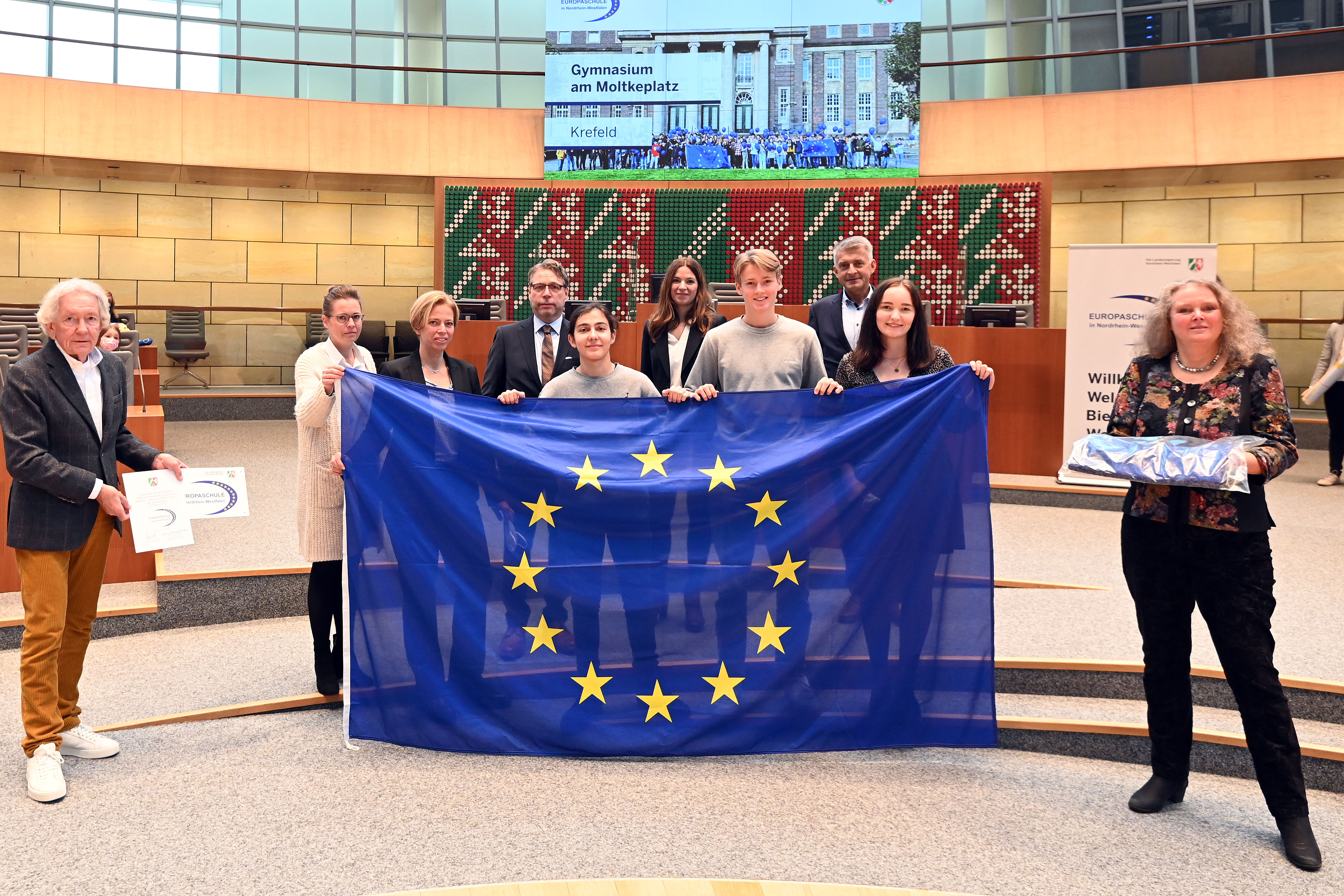 Am 19. November 2021 ist das Gymnasium am Moltkeplatz mit dem Zertifikat „Europaschule in NRW“ in einer Feierstunde im Düsseldorfer Landtag ausgezeichnet worden. Die Vertreterinnen und Vertreter der Schule um Schulleiter Dr. Thomas Zöllner, Europaschulkoordinatorin Susanne Zühlke, Schülersprecher Keyhan Kahraman und Schulpflegschaftsvorsitzenden Marcus Stocks folgten einer Einladung in den Landtag. „Ich freue mich sehr, dass wir heute hier sein dürfen und die Jury mit unserem vielfältigen Angebot zum Thema Europa, unserem großen Sprachensortiment, den Austauschen und Wettbewerben und nicht zuletzt dem bilingualen Sportzweig überzeugt haben“, äußerte sich der Schülersprecher zufrieden.