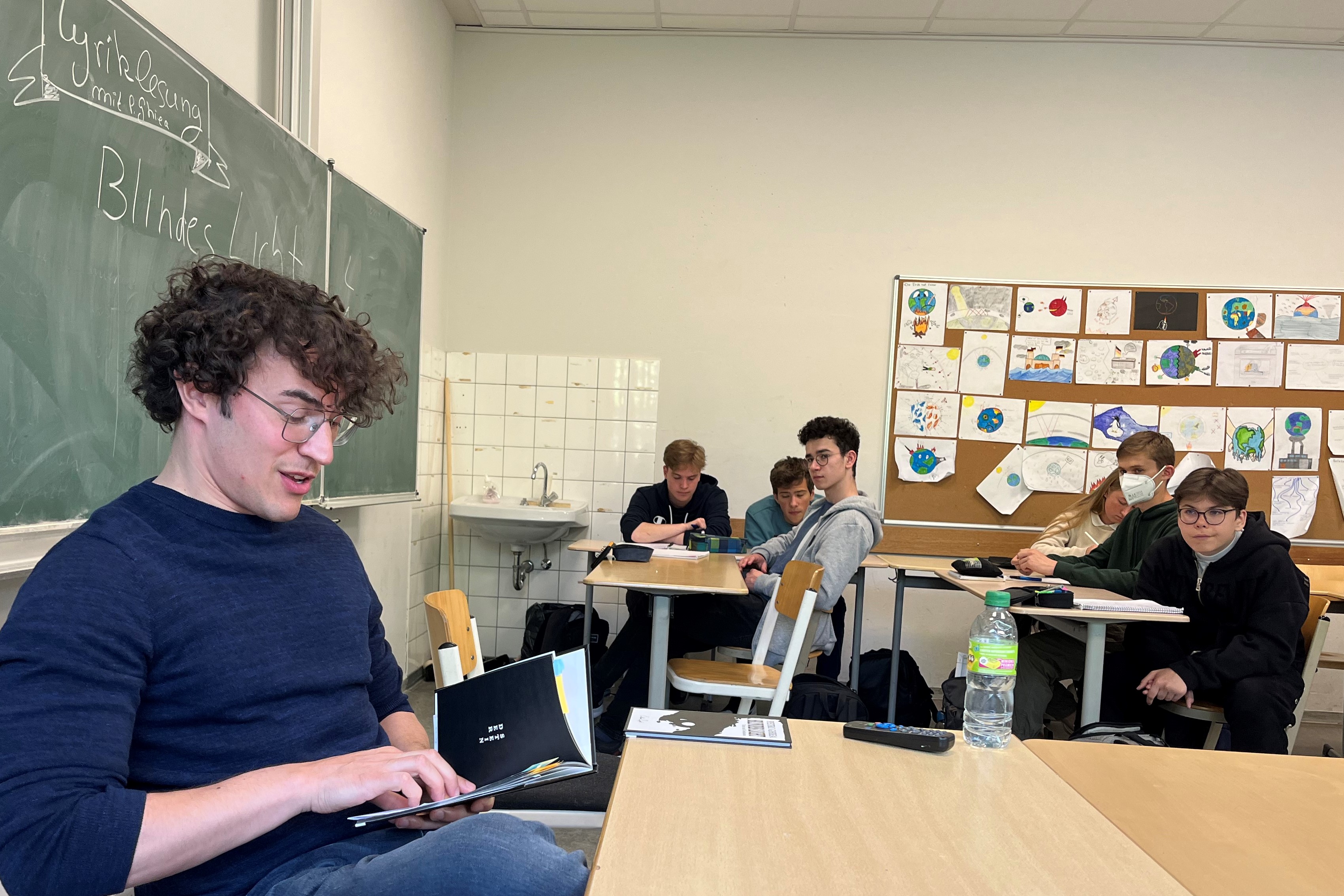 Petru Ghiea, welcher als Düsseldorfer Autor ein eigenes Lyrikbuch mit dem Titel „Blindes Licht“ veröffentlicht hat, ließ die Schülerinnen und Schüler an seinen tiefsten lyrischen Gedanken und dem Entstehungsprozess teilhaben und hatte zu jedem seiner Texte eine kleine Anekdote parat.