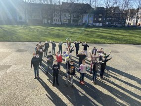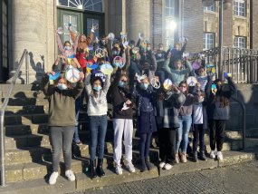 Schülerinnen und Schüler aus allen Jahrgangsstufen haben in den letzten Tagen Friedenszeichen gestaltet, welche sehr präsent im Treppenaufgang zu einem Gesamtwerk vereint wurden, um die große Solidarität mit den Menschen der Ukraine auszudrücken. Ferner bereitet die SV aufgrund des spürbar großen Wunsches der Schülerinnen und Schüler nach Aufklärung eine Klassenlehrerstunde vor, um über den Krieg, aber auch über die Berichterstattung und seriöse Informationsquellen zu informieren.